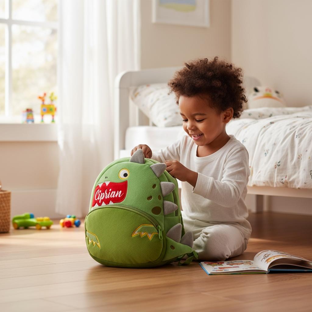 Acest ghiozdan dinozaur personalizat de un verde vibrant este perfect pentru cei mici care adoră să își exprime personalitatea și să se simtă în largul lor în timp ce explorează lumea în jurul lor.